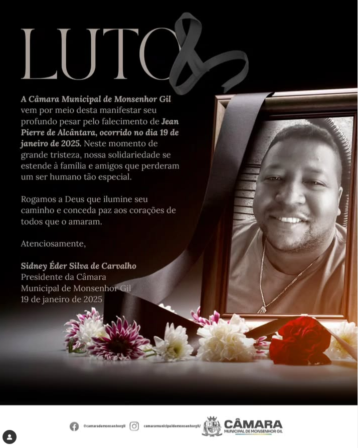 A Câmara Municipal de Monsenhor Gil vem, por meio desta, manifestar seu profundo pesar pelo falecimento de Jean Pierre de Alcântara, ocorrido no dia 19 de janeiro de 2025. Neste momento de grande tristeza, nossa solidariedade se estende à família, amigos e a todos que perderam um ser humano tão especial.